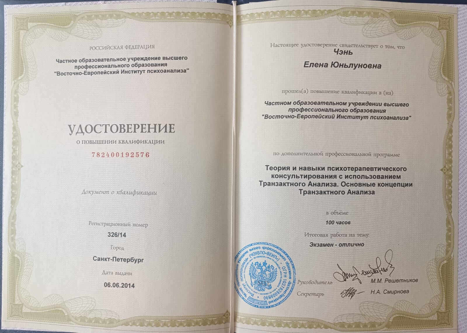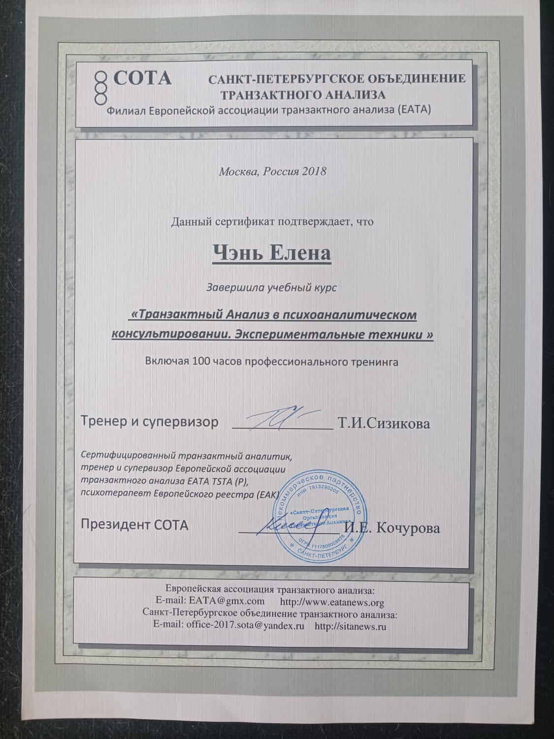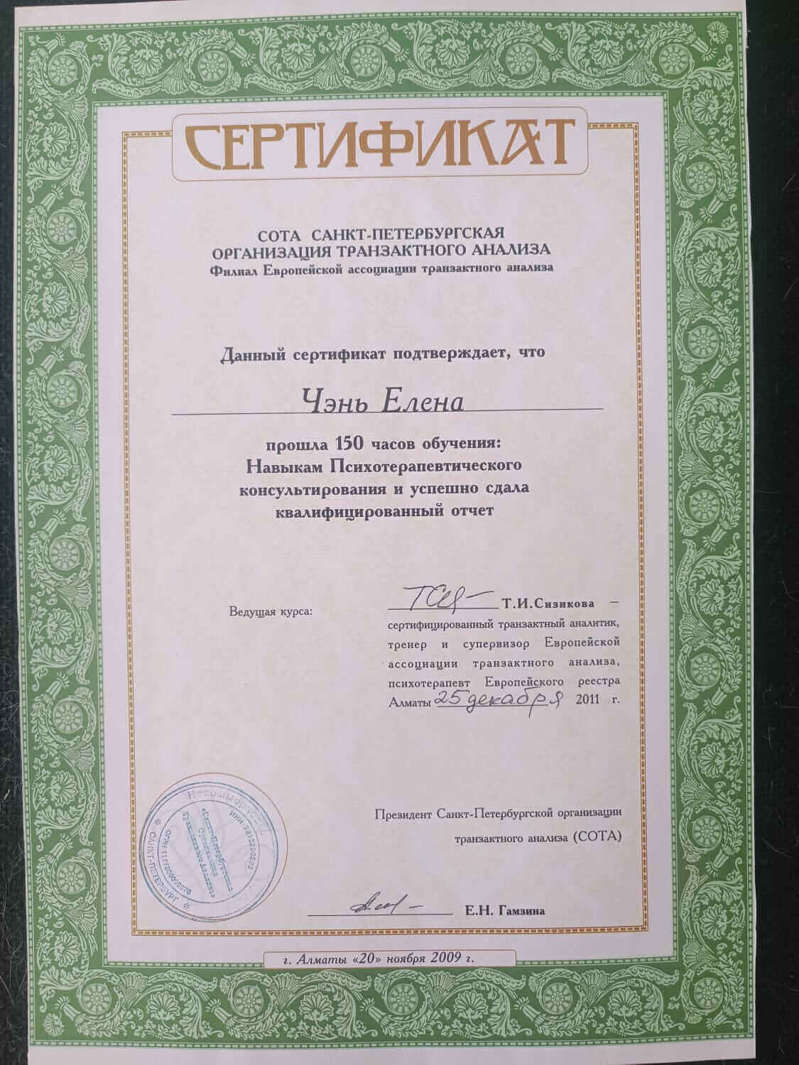 Обучалась в Казахстанско-Российском Университете с 2000-2005 г. В 2008 году начала обучение модальности Транзактного Анализа у Т. Сизиковой 101 курс. Продолжаю обучение 202 курса в Санкт-Петербурге. Консультировать начала с 2009 года. И по сей день провожу консультации/психотерапию индивидуально, терапию пар и в группе. Готова Вам помочь в решении Ваших проблем, либо в достижении желаемого результата. В комфортно безопасные и конфиденциальные взаимоотношения для бережного изменения вашего желаемого результата. При первой встречи чаще всего человек замечает изменения. Помощь требуется человеку не только в состояниях кризиса и внутреннего конфликта. А также помогает и здоровому человеку узнать свои «слабые» места и сильные стороны, пройти затруднительную ситуацию, перестать совершать одни и те же ошибки, улучшить взаимоотношения с собой и с другими и т.д. Присвоена квалификация "модератор" (2 категория). Я не работаю с людьми имеющими наркотическую зависимость и имеющие психиатрические заболевания.