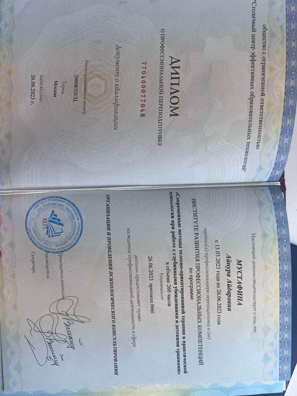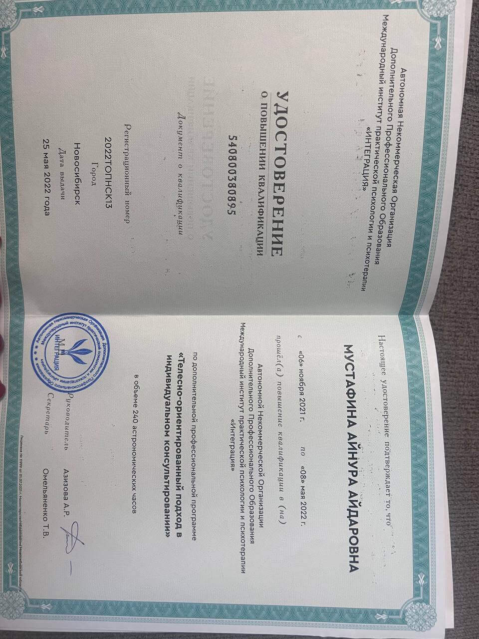 - Международный институт практической психологии и психотерапии "Интеграция" (г. Новосибирск) по специальности " Телесно-ориентированный подход в индивидуальном консультировании" - Диплом Института развития профессиональных компетенций по специальности "Организация и проведение психологического консультирования". - Международный институт практической психологии и психотерапии "Интеграция" (г. Новосибирск) курс повышения квалификации по программе "Групповая психотерапия. Основы психодинамических процессов. Структура группы проживания" - Международный институт практической психологии и психотерапии "Интеграция" (г. Новосибирск) курс повышения квалификации по программе "Возрастная психология телесного развития".