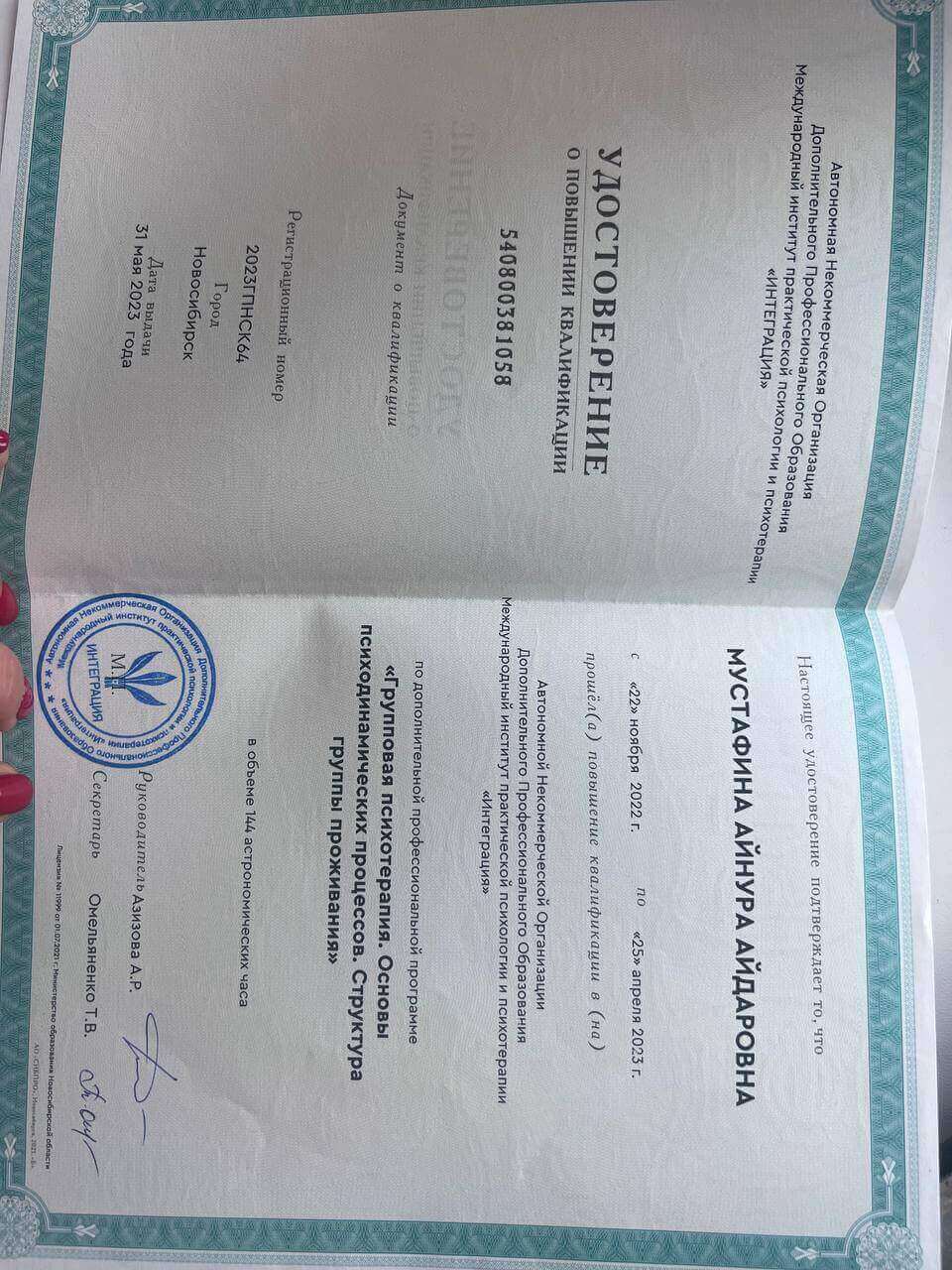 - Международный институт практической психологии и психотерапии "Интеграция" (г. Новосибирск) по специальности " Телесно-ориентированный подход в индивидуальном консультировании" - Диплом Института развития профессиональных компетенций по специальности "Организация и проведение психологического консультирования". - Международный институт практической психологии и психотерапии "Интеграция" (г. Новосибирск) курс повышения квалификации по программе "Групповая психотерапия. Основы психодинамических процессов. Структура группы проживания" - Международный институт практической психологии и психотерапии "Интеграция" (г. Новосибирск) курс повышения квалификации по программе "Возрастная психология телесного развития".