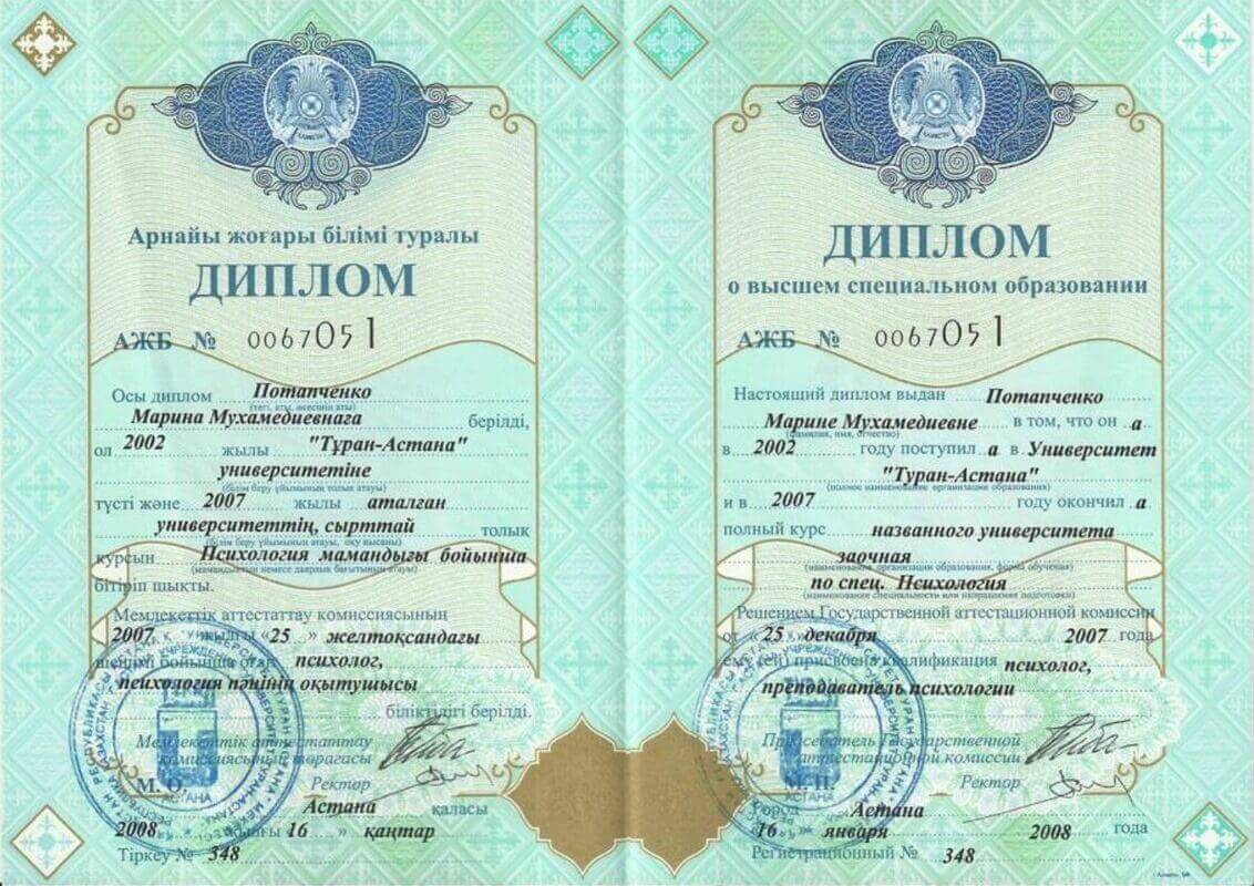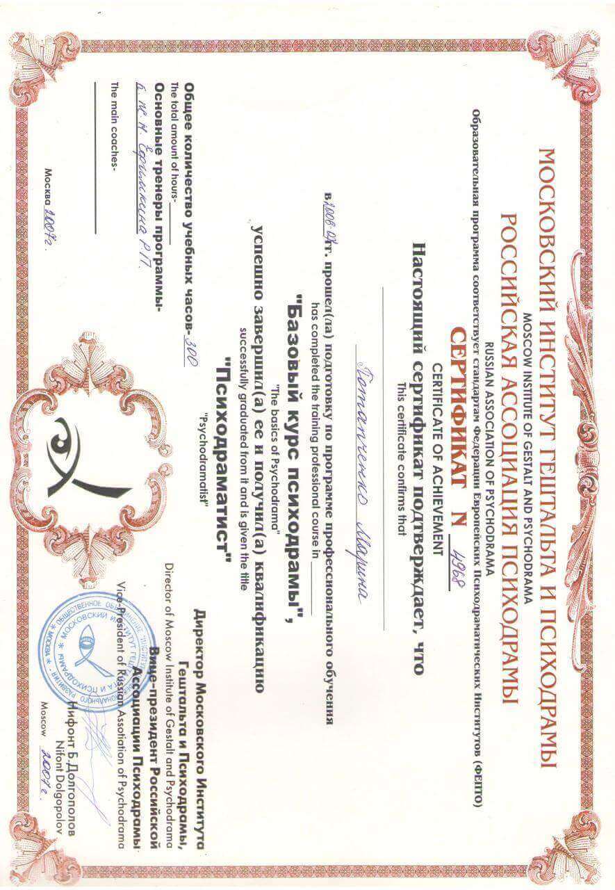 2002-2007 г. Университет «Туран-Астана», факультет психологии, психолог, преподаватель психологии. ( Специалист) 2003-2007 г. Московский Институт Гештальта и Психодрамы. Психодраматист. 2019 г. - Сертификат практического курса телесно - ориентированной терапии «Введение в психосоматику» 2014 г. - Свидетельство Действительный член Профессиональной Психотерапевтической лиги. 2014 г. - Сертификат аккредитации Квалификация Ассоциированный тренер II уровень Евразийский институт практической психологии и психотерапии. 2011- Интегративная системная семейная и супружеская терапия 2013 г. (системные семейные расстановки по методу Б. Хеллингера). Институт интегративной семейной терапии. г. Москва. Продолжительность 320 часов. 2012 г.- Семейная психотерапия. Евразийский институт практической психологии и психотерапии. 2012 г. - I Модуль специализации по интегративной психологии «Персона» Сертификат Международной Академии Психологических наук. Института Интегративной Психологии Профессионального Развития. 2008 г. - Артгештальтконсультирование - I ступень МИГИП г. Москва 2006 - Обучение и развитие персонала. Сертификат Школа Бизнеса «Люди Дела» г. Новосибирск. Квалификация Бизнес тренер.