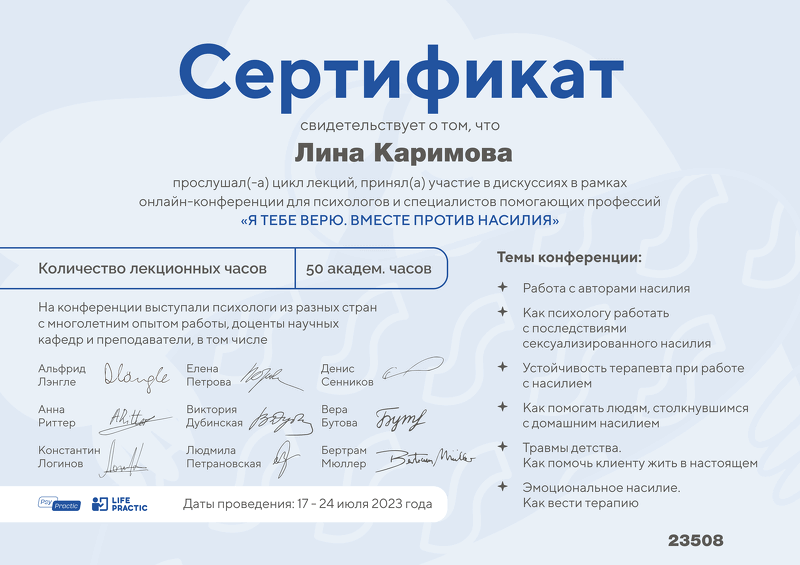 Работа с Линой была для меня очень полезной. Она помогла мне разобраться в моих проблемах и почувствовать себя лучше. Рекомендую как профессионального и чуткого специалиста