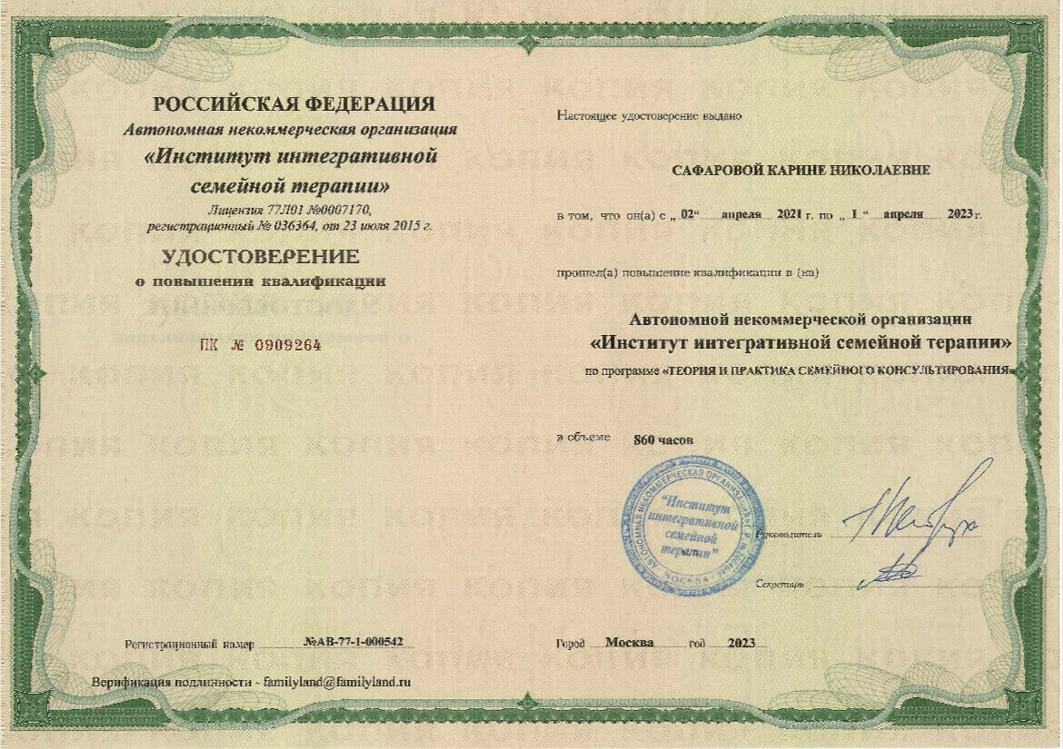 Меня зовут Карина Сафарова, я семейный системный психолог. Работаю с клиентами в формате индивидуальной терапии, а также веду консультативный прием для пар и семей. В своей работе применяю интегративную модель, объединяя методы семейной системной терапии, перинатальной психологии, травматерапии, проективные и арт-терапевтические направления, телесно-ориентированные техники. ✔️ Ко мне обращаются с такими ЗАПРОСАМИ, как ● Травматический детский опыт и его последствия во взрослой жизни ● Проблемные, болезненные отношения с родителями, близкими людьми и окружающим миром ● Семейные кризисы, проблемы в супружеских отношениях ● Сложности в реализации опыта родительства бесплодие, перинатальные потери, смешанные чувства в отношении фигуры материнства/отцовства ● Деньги и взаимоотношения с ними в жизни, в семье, в профессии ● Личностный рост, поиск своего пути и реализации ● Самоценность, обретение внутренней опоры, личностной силы и веры в себя ● Психосоматика и работа с эмоциональным фоном при установленном заболевании ● Работа со сложными чувствами и переживаниями (стыд, вина, страх, злость, гнев, бессилие) ● Проживание горя и утраты