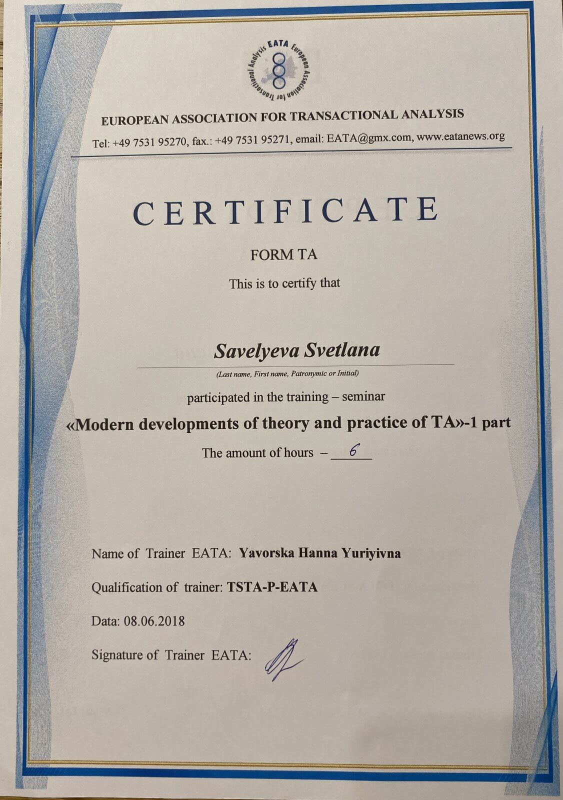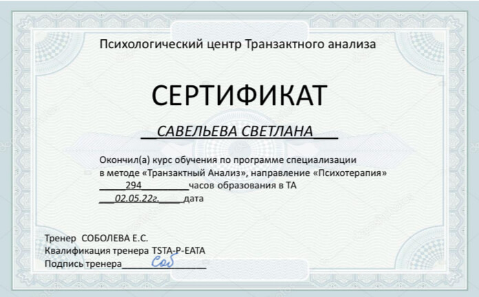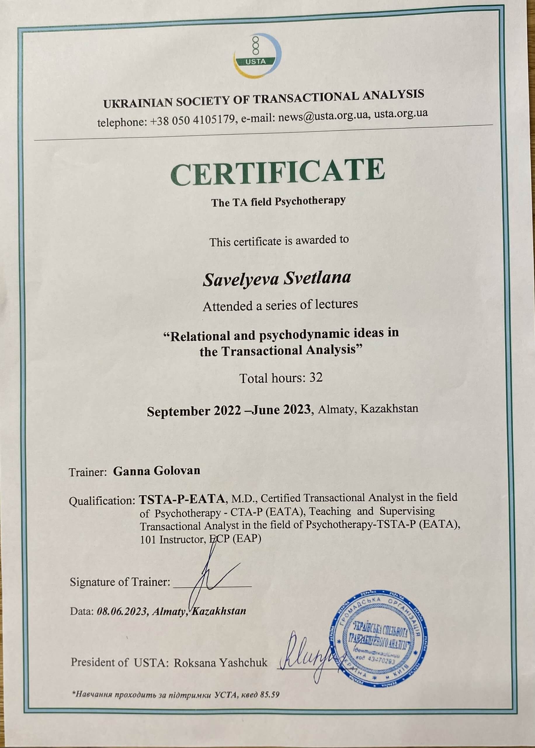 Я психолог в модальности Транзактный Анализ. Я прошла 5 летнее обучение в Алматы, затем 2 летнее у моего любимого преподавателя Соболевой Елены, г. Санкт Петербург. Затем годичные программы по работе с Группами, Транзактный Анализ и Психодинамические и Реляционные направления.