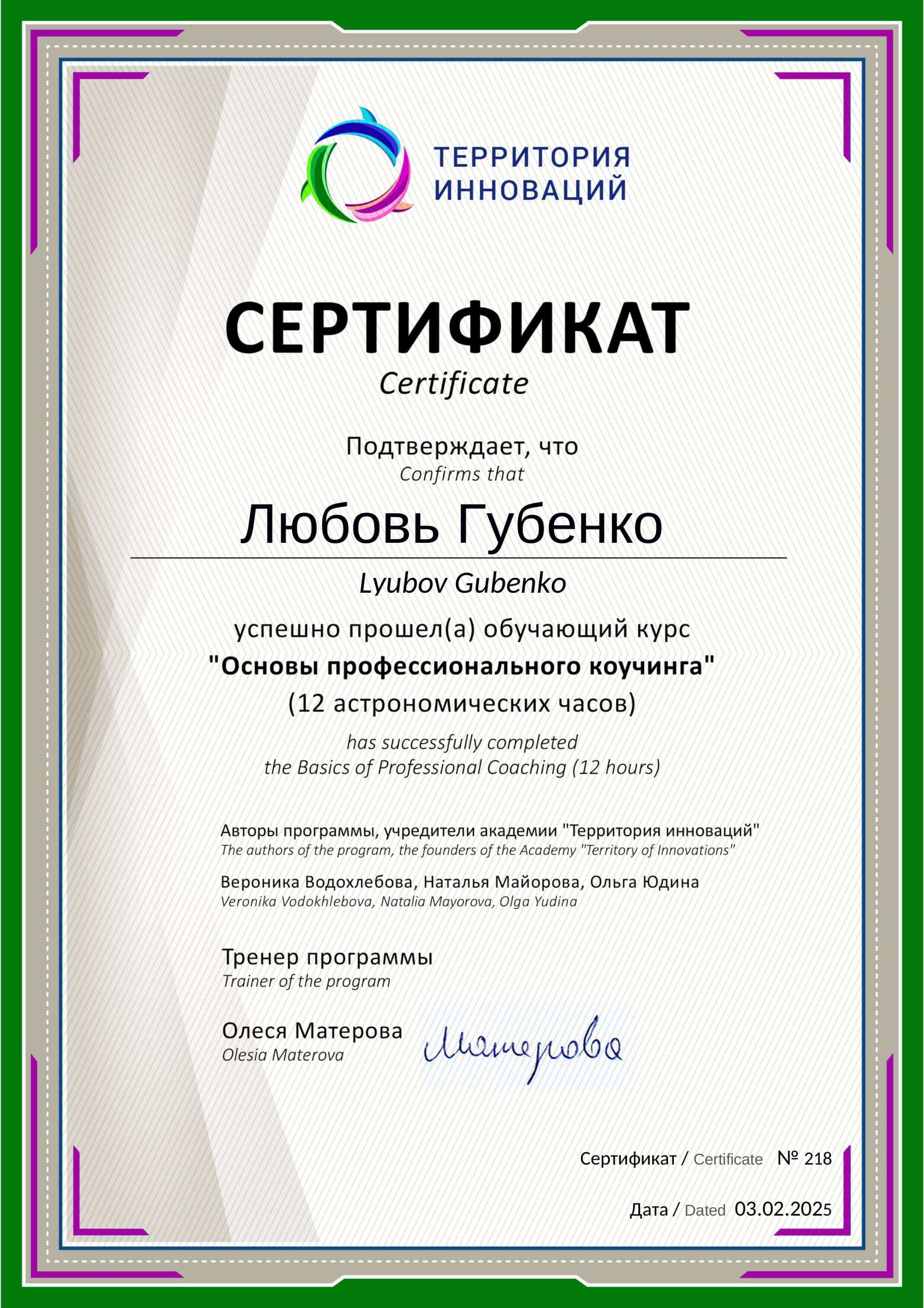 Современная Гуманитарная Академия Специальность Психология Квалификация Психолог Годы обучения 2011 - 2015 Авторская методика Олеси Матёровой радикальное изменение мышления и поведения (РИМП) Выдан Общество с ограниченной ответственностью «Учебный центр «ПРОФИ» ЛОД Продолжительность 28 часов Год получения 2025 CCE Основы профессионального коучинга Выдан Территория инноваций Продолжительность 12 часов Год получения 2025 Управление финансами "Деньги и благополучие" Выдан Общество с ограниченной ответственностью "Учебный центр ПРОФИ" ЛОД Продолжительность 50 часов Год получения 2024 Сертифицированный голографический коуч Выдан Международная Академия Голографического коучинга и ментального тренерства Год получения 2023 Голографический коучинг Выдан Международная Академия Голографического Кoучинга IHCA Год получения 2018