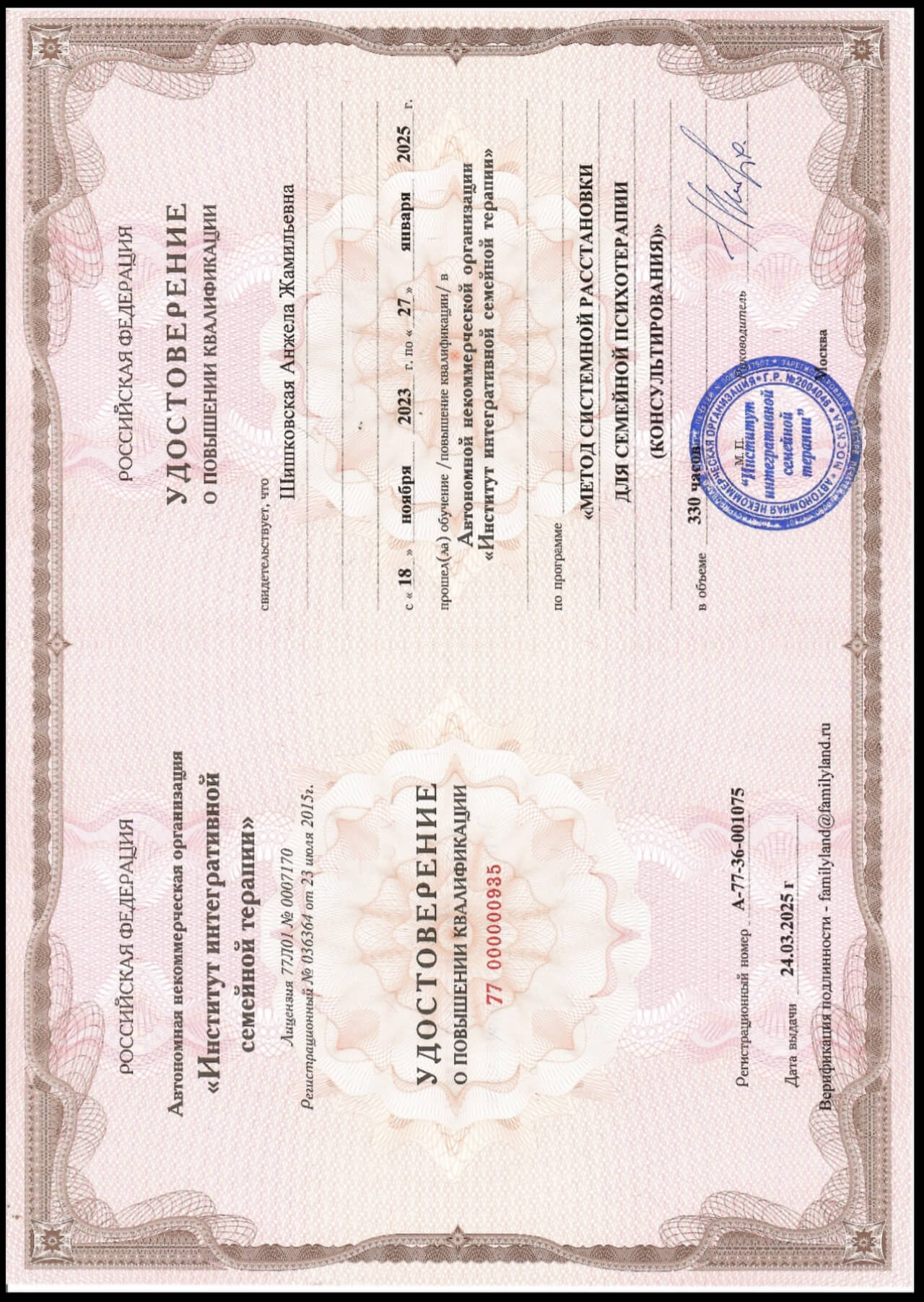 1. Практический психолог, интегративный подход (Институт Психотерапии и Клинической Психологии г.Москва). 2. Программа дополнительного профессионального образования по программе "Метод системной расстановки для семейной психотерапии" (Московский Институт Интегративной семейной терапии).