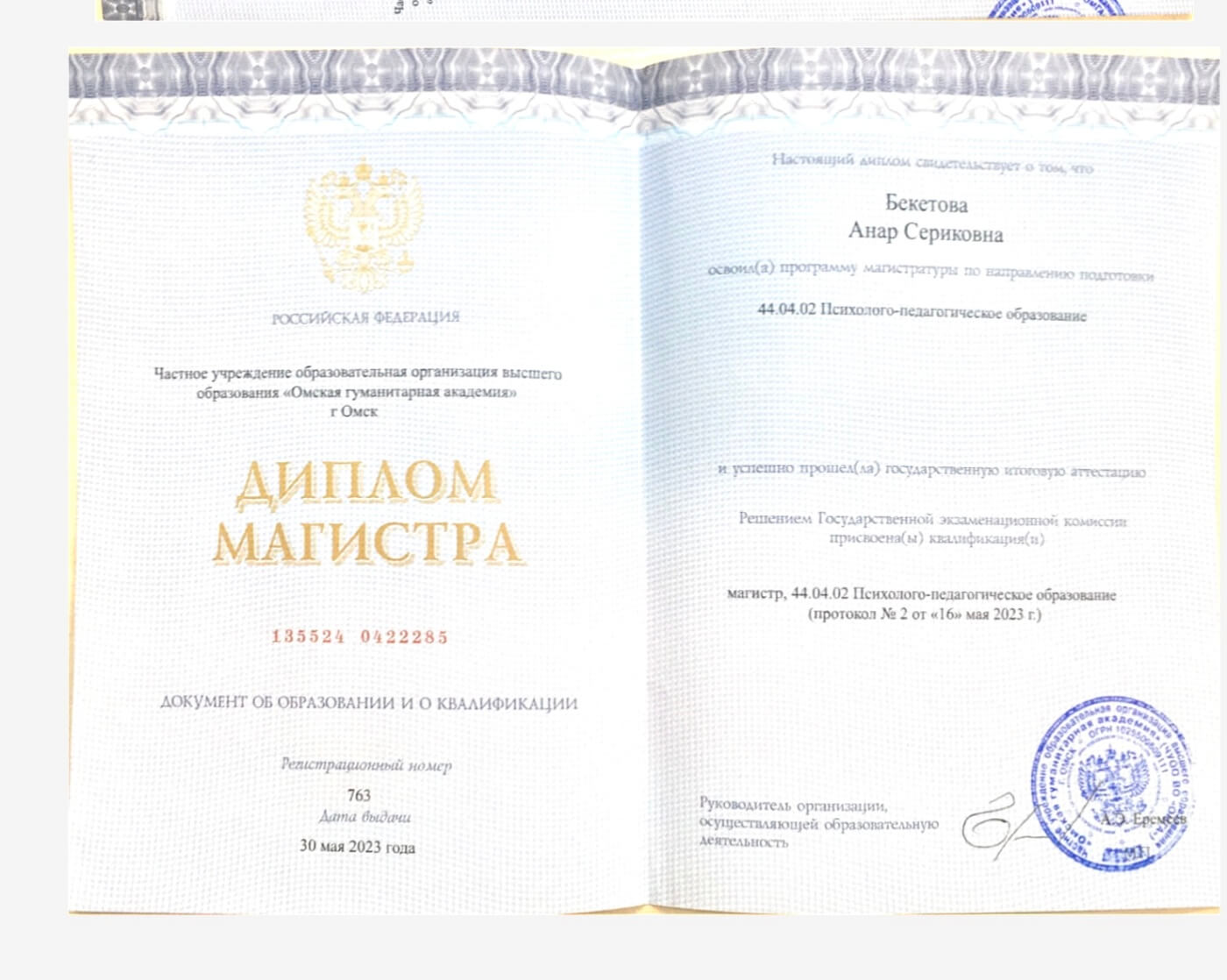 Мое образование Казахстан, Кокшетауский Государственный институт им.Шокана Уалиханова Педагог психолог (бакалавр) Российская Федерация Омская гуманитарная Академия Детский психолог (Магистр психологических наук) London,Коуч Международной компании Wisefull