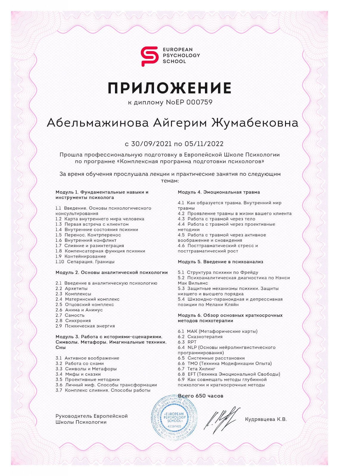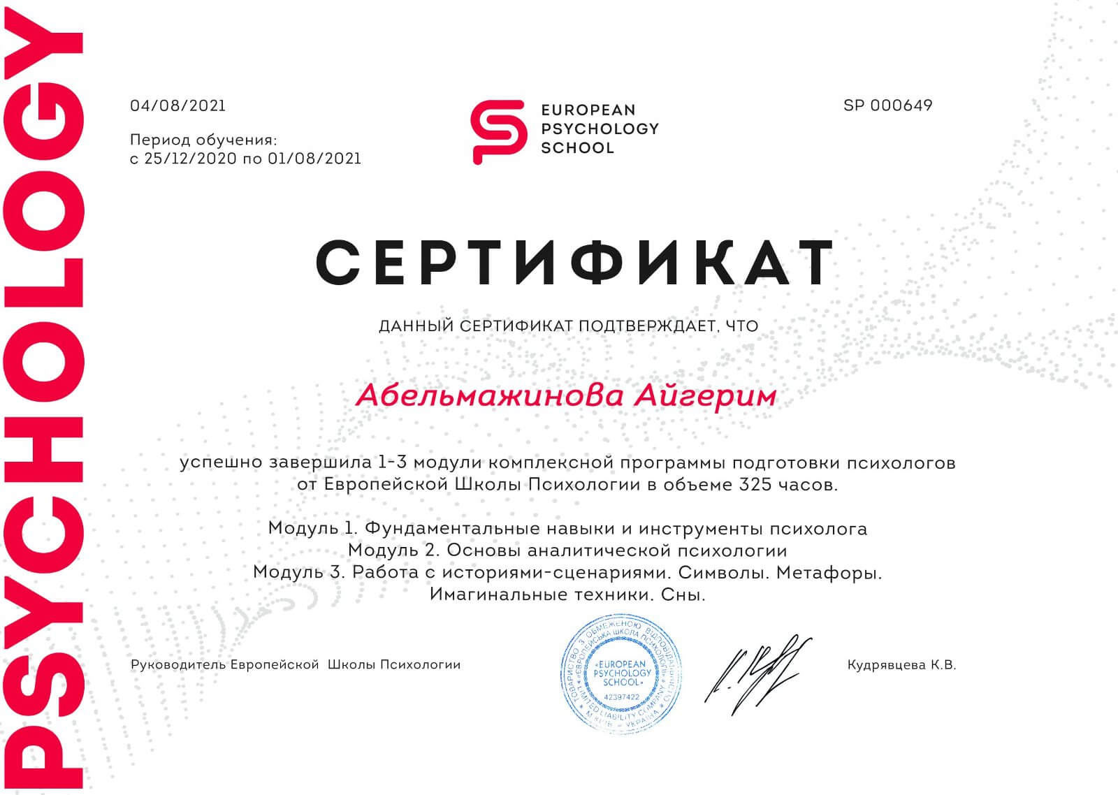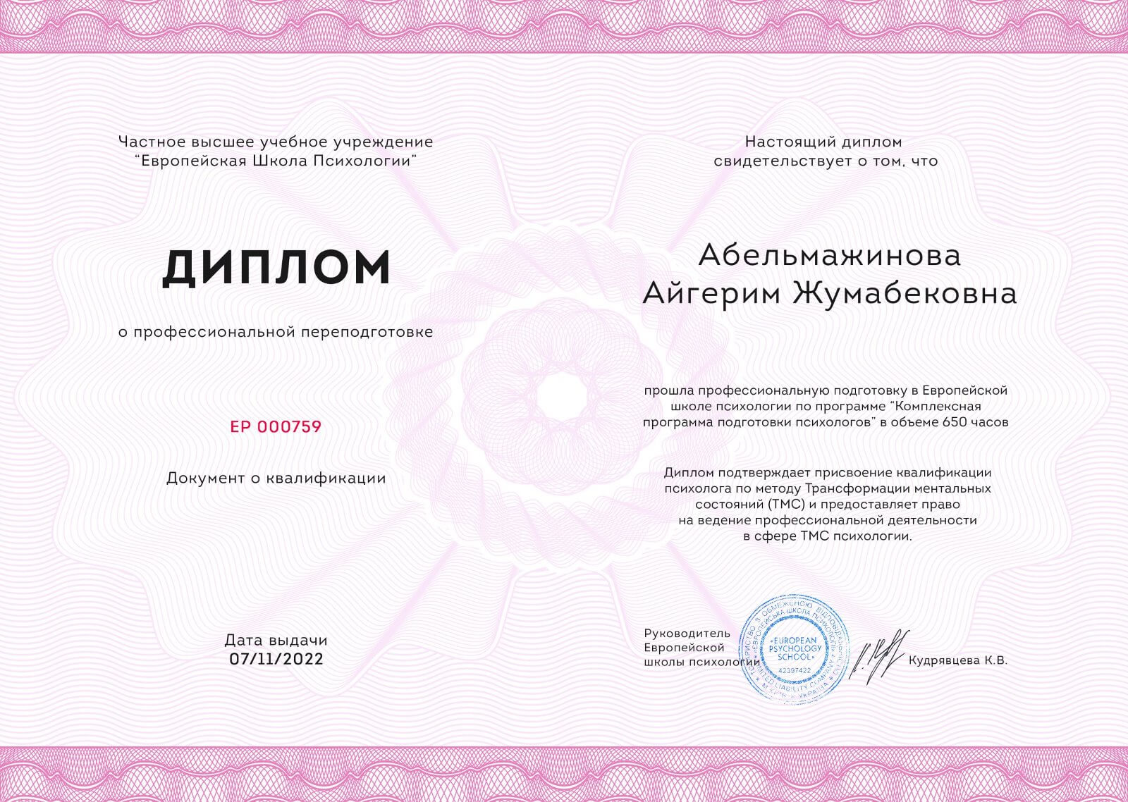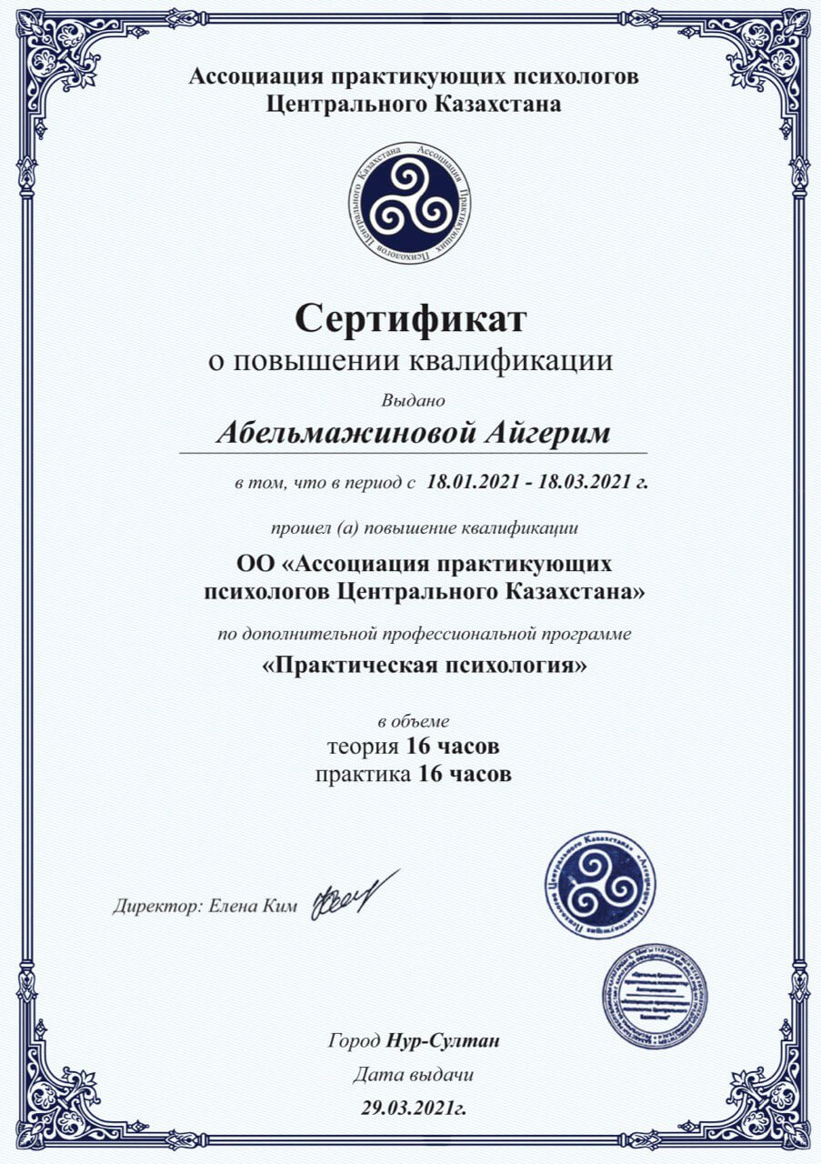 Дистанционное высшее психологическое образование в Европейской школе психологии на протяжении 2лет. Украина. Аналитическая психология (глубинная). То есть работа будет вестись как на сознательном уровне, так и на полусознательном и бессознательном уровнях психики. В настоящий момент получаю магистерскую степень в психологии в ВУЗе Казахстана.