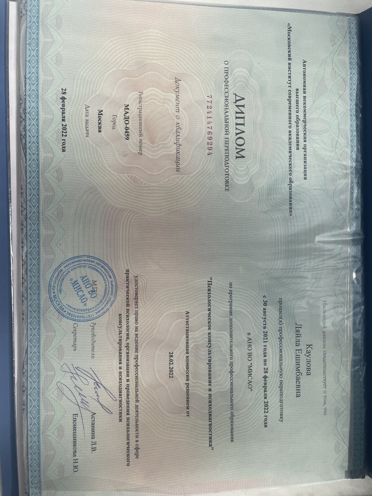 Окончила Московский Гештальт Институт (2020-2024 годы), Московскую академию дистанционного образования (2023). Другие дипломы диплом с отличием о высшем образовании КазГУМОиМЯ, специальность иностранная филология, два иностранных языка
