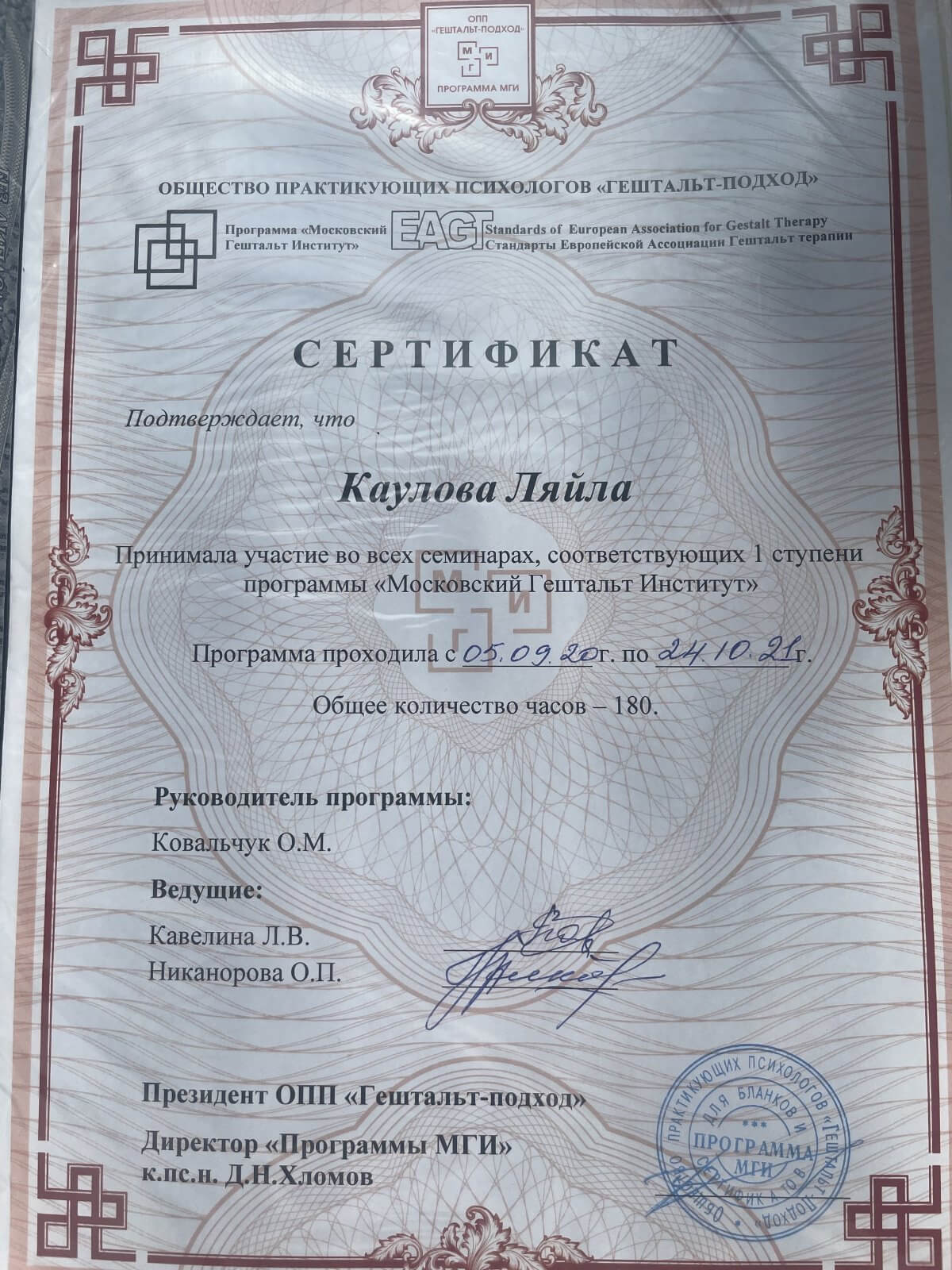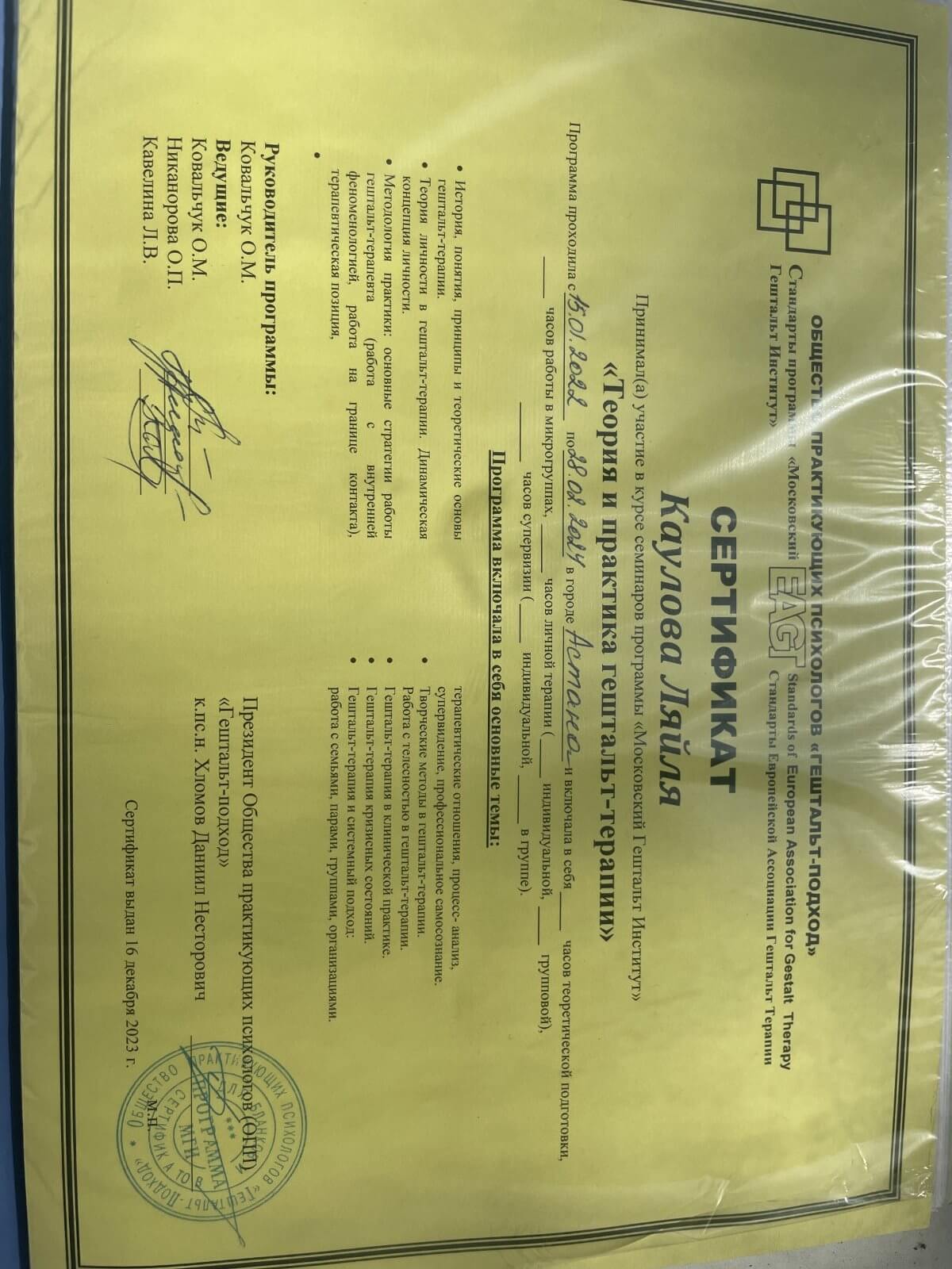 Добрый день! Меня зовут Каулова Ляйла, я гештальт-терапевт, детский и подростковый психолог. Работаю как со взрослыми, так и с детьми. Окончила Московский Гештальт Институт (2020-2024), диплом МАДО (2023 год). Проживаю в городе Астана, Казахстан. Принимаю оффлайн и онлайн