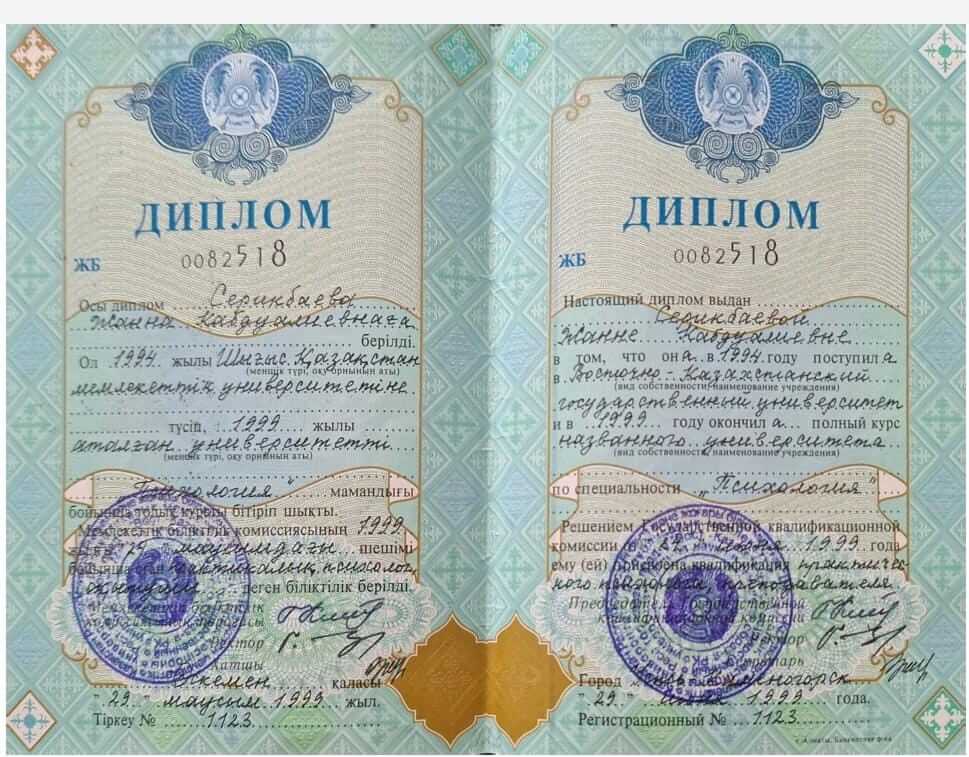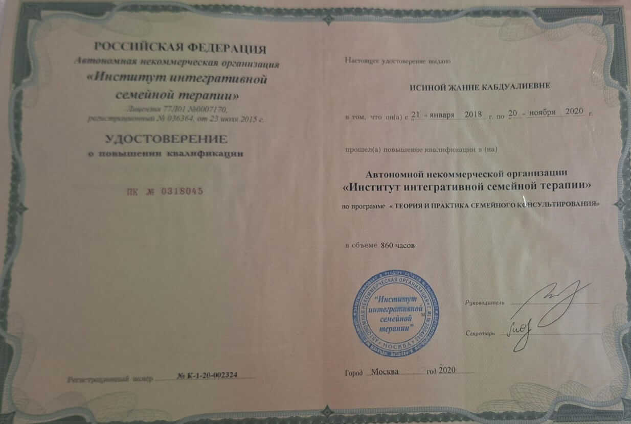 Высшее, закончила Восточно-Казахстанский государственный университет по специальности «Психология», практический психолог-преподаватель. В 2020 году в ИИСТ переквалифицировалась на системного семейного терапевта. Кроме того, прошла обучение по арт-терапии и МАК-картам. В 2024 году прошла обучение по психологии современной семьи.