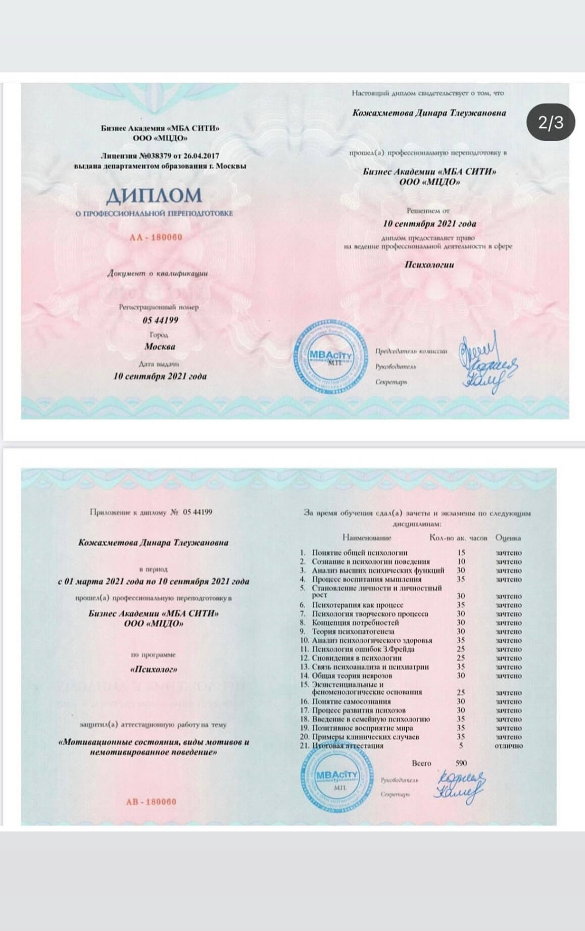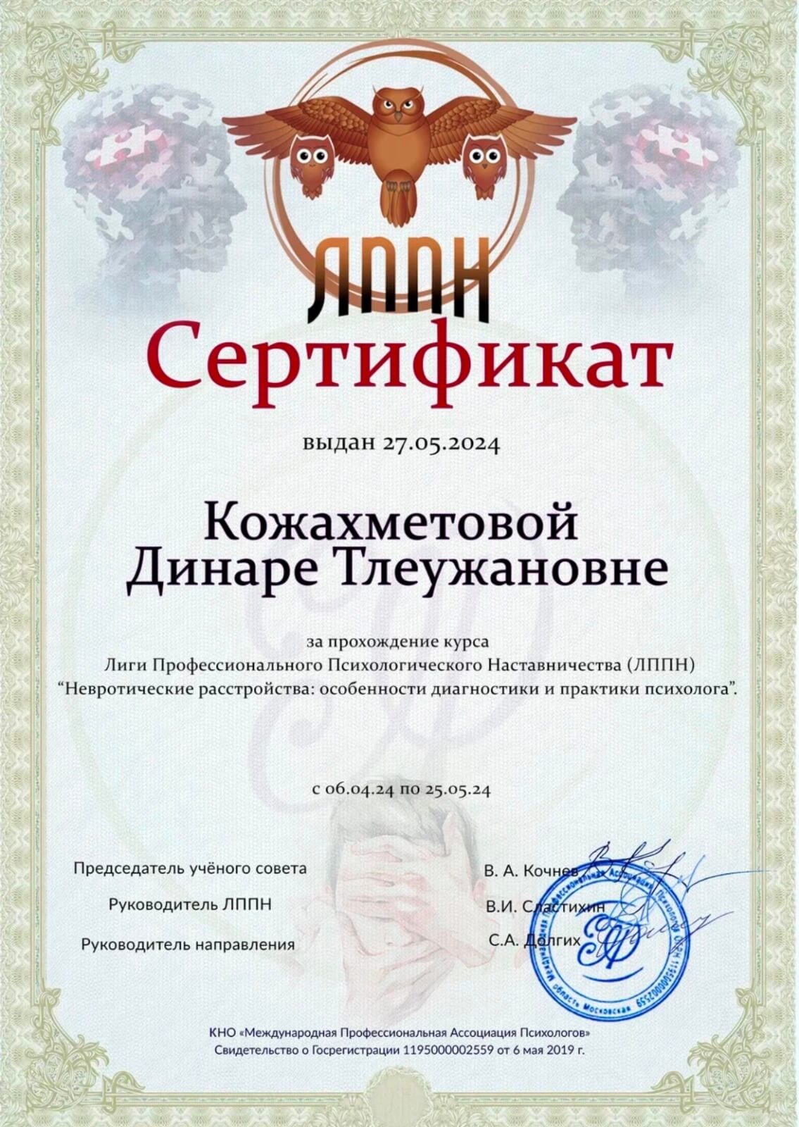 Родительский Университет гуманной педагогики, г.Астана. Бизнес -Академия МБА Сити, г.Москва - психолог. Евразийский Институт Практической Психологии и Психотерапии (ЕИППП) г. Астана -практический психолог. ЕИППП г.Москва - кризисный психолог. Международная тренинговая компания «Основа» г.Киев -арт-коуч. 91 game transformation, г.Астана -игропрактик. International Education Center Psychology school, г.Киев - Когнитивно-поведенческая терапия. Казахстанская Ассоциация Когнитивно-поведенческой терапии, г.Астана - научно доказанные техники по работе с виной, стыдом и самокритикой. IECPS, г.Киев - психиатрия для психологов. НАО «Медицинский университет Астаны» г.Астана - актуальные вопросы клинической психологии. ЛППН «Методы трансактного анализа в консультировании и психотерапии», г.Москва. ЛППН «Сексология в психологическом консультировании», г.Москва.